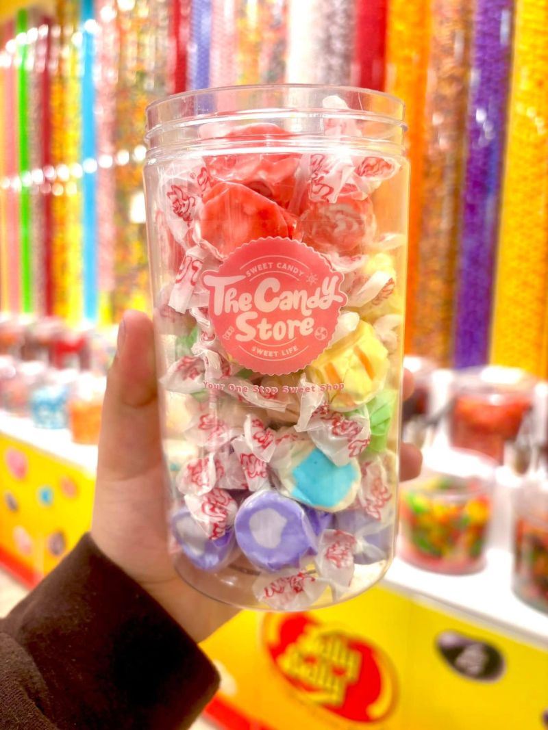 A spacious candy store with floor to ceiling shelves packed with all the goodies. They offer a variety of candies, ice cream, drinks, freeze dried candies and more.