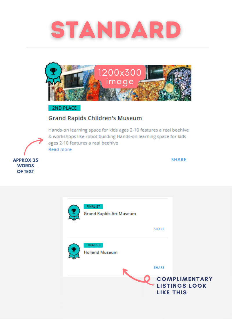 Increased ad visibility – graphic and text take up more space on the winner’s list than complimentary listings |
