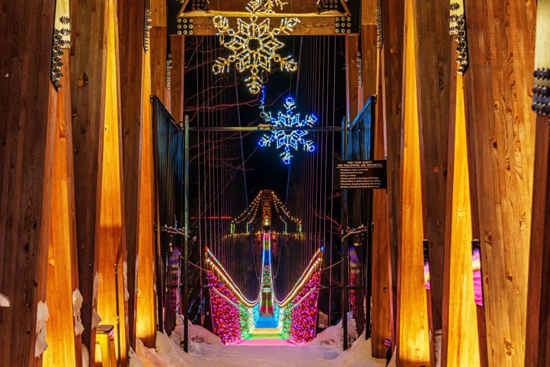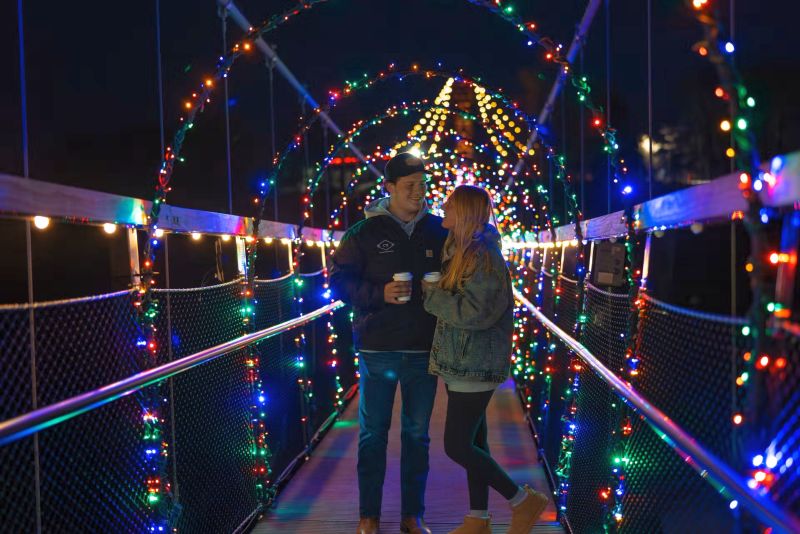 Named “Lights in the Sky,” this walk-through lights adventure invites visitors to bundle up and cross the world’s longest timber-towered suspension bridge, surrounded by the magic glow of 200,000 twinkle lights.