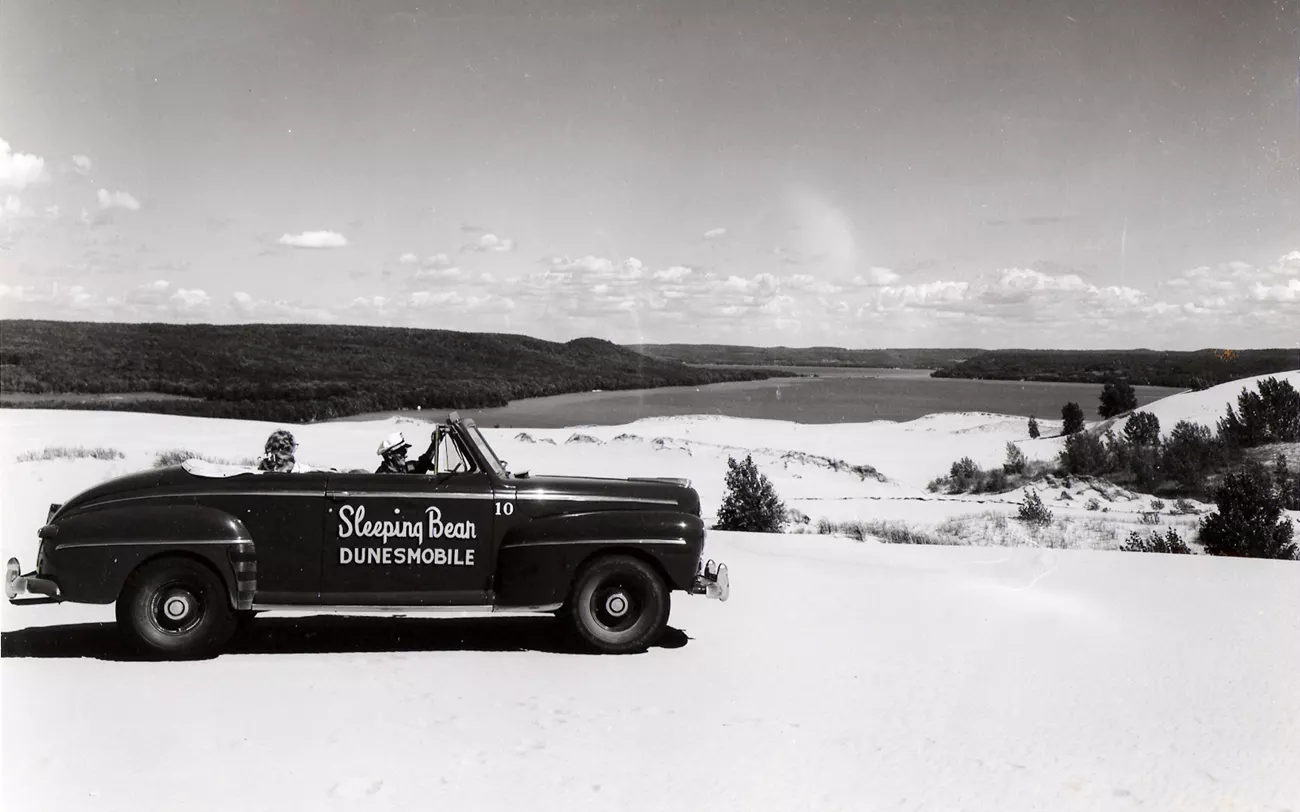 Equipped with customized tires, Dunesmobiles sped up and over the sandy dunes, thrilling riders. Many visitors enjoyed these dune rides during their 40+ years in operation. The tours ended in 1978, an act of dune preservation.