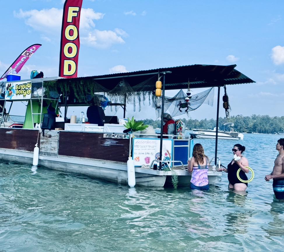 How fun is a floating food boat?! The Bayou Barge serves up delicious burgers, hot dogs, and more from the Torch Lake Sand Bar.